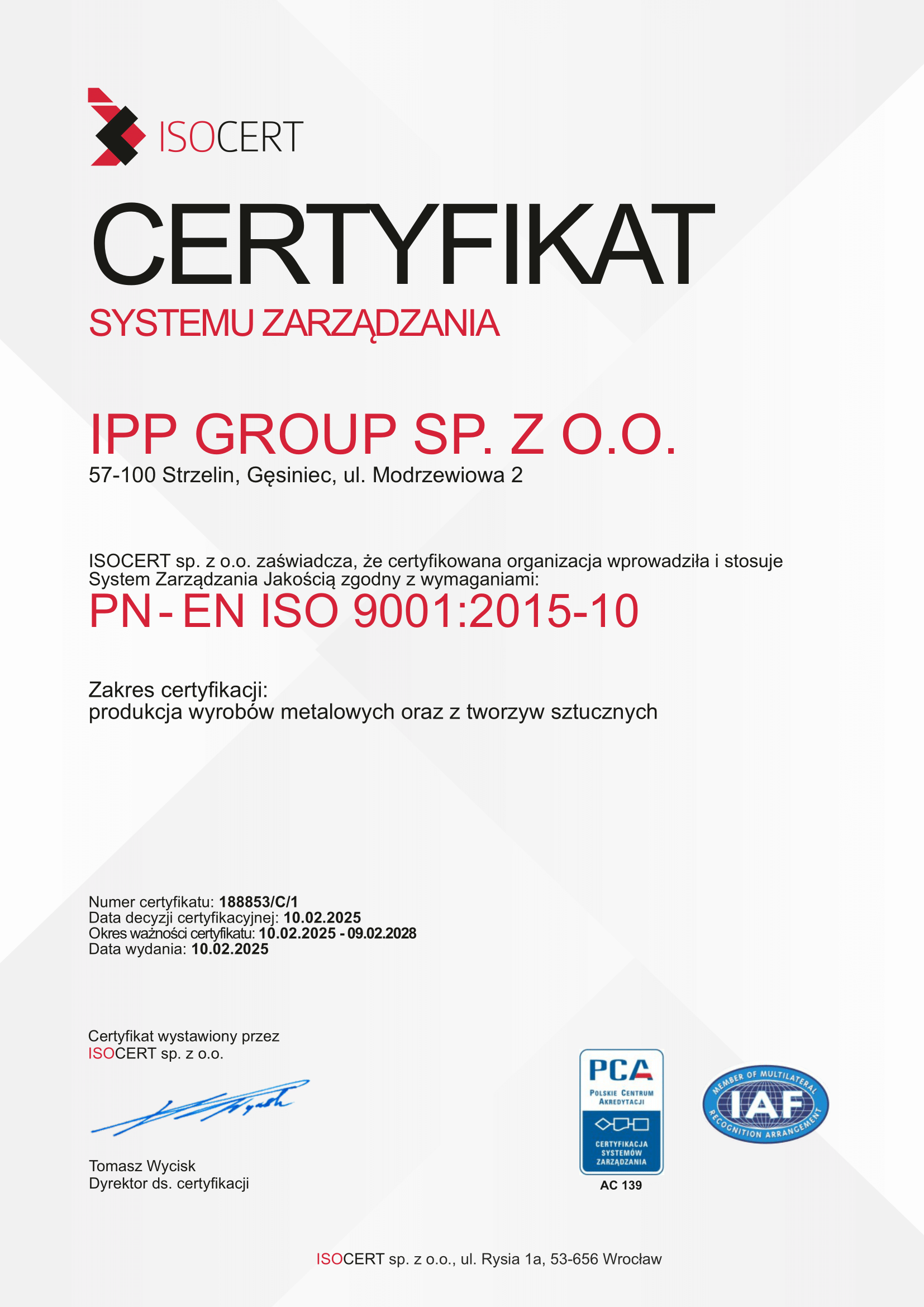 Z przyjemnością informujemy, że IPP GROUP SP. Z O.O. uzyskało certyfikat Systemu Zarządzania Jakością zgodny z normą PN-EN ISO 9001:2015-10. Certyfikat ten potwierdza, że nasza organizacja wdrożyła i skutecznie utrzymuje system zarządzania, który gwarantuje wysoką jakość usług i produktów w zakresie produkcji wyrobów metalowych oraz z tworzyw sztucznych.